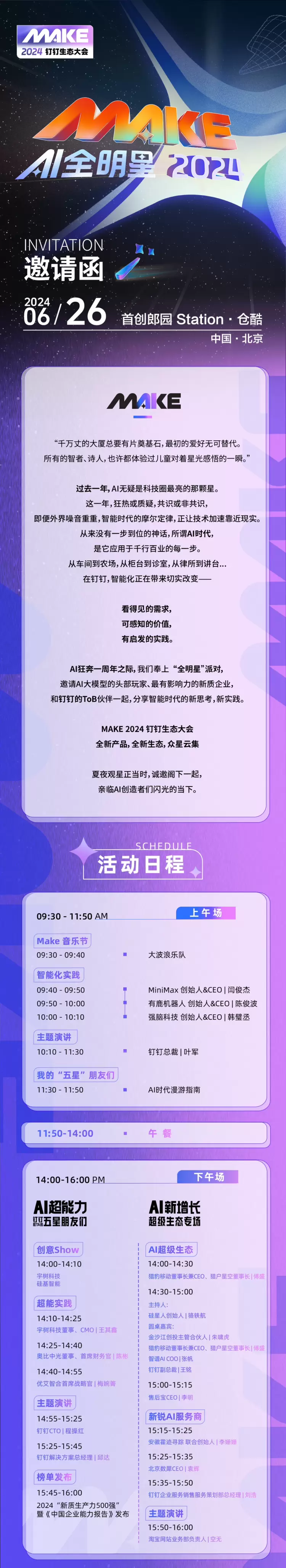 6月26日,钉钉将在北京举办“2024钉钉生态大会”。本次大会以“Make2024:AI全明星”为主题,汇聚了众多钉钉AI生态伙伴和人工智能行业领军人物,共同见证钉钉7.6版本的发布,并深入探讨AI如何赋能企业,推动生产力革新。