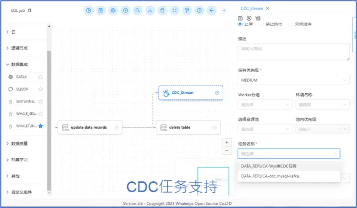 现在越来越多的用户开始使用实时数据仓库,从数据CDC抽取到数据实时加工及展示,从而支持风控、经济业务、银行在线分析等实时场景。在2.6版本中,我们还新增了对多种实时任务的全面支持,用户可以更便捷地进行编辑、管理、控制和删除操作,全面升级用户实时数据仓库开发能力。这些实时任务包括: