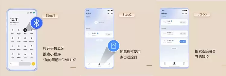 与传统APP控制不同,美的照明数字遥控器无需每款产品对应一个APP,更无需复杂配网,通过手机蓝牙,搜索小程序“美的照明HOMLUX”点击“遥控器”,即可找到想要连接的设备,一键开启智控。回到家,开灯、开浴霸,操控晾衣机收衣服,无需到处找遥控器,用手机就能轻松搞定,大大节省时间,让业余居家生活更舒适。