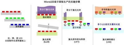 1) 红、绿、蓝三色 LED 分别制作在透明基板生长晶圆上。2) LLO:生长晶圆上的 LED 与带有粘合剂的临时载板接触并固定,准分子激光透过透明基板聚焦并将 LED 与其分离。3) LIFT:准分子激光透过临时载板聚焦,选择性分离各个单颗 LED,并将它们转移到最终基板上的焊盘位置。4) LAB:半导体激光一次加热多颗 LED 和焊料,使其快速熔化并形成最终键合。