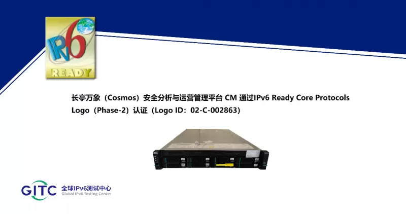 近日,北京长亭科技有限公司旗下长亭万象(Cosmos)安全分析与运营管理平台 CM在下一代互联网国家工程中心-全球IPv6测试中心正式通过IPv6 Ready核心协议Phase-2测试,并荣获由国际组织IPv6 Forum颁发的IPv6 Ready Logo Phase-2认证证书(Logo ID:02-C-002863)。这标志着上述产品的IPv6核心协议实现已全面符合IETF RFC相关标准,其一致性和互通性得到了权威验证。