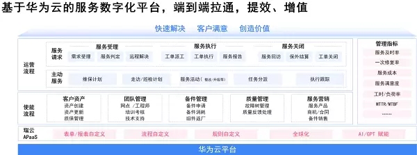 瑞云服务云基于华为云平台的技术支撑以及华为的ITR管理体系,打造了大中型企业一体化售后服务管理平台。在底层平台上应用了华为的先进技术;在管理体系上,构建了两大主要流程,包括运营流程和使能流程。