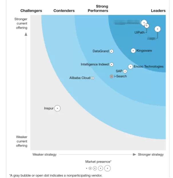 根据知名机构Forrester发布的2022年Q3中国RPA厂商报告,我们可以看到国内RPA厂商的实力分布。