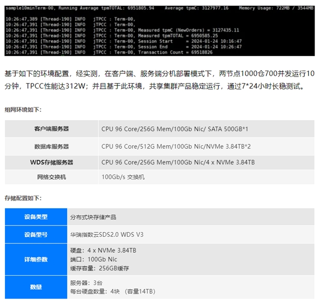 进入性能测试阶段,YashanDB搭配华瑞指数云SDS2.0产品,在TPC-C基准测试中直接与Oracle数据库展开“较量”,基于iSCSI协议链接计算与存储节点,展现出了显著优势。测试结果显示,系统的性能最优值达到了207万tpmC,相较于Oracle RAC方案的114万tpmC,实现了大幅度的性能提升。尤其是在1000仓库、1400并发的场景下,性能表现尤为突出。