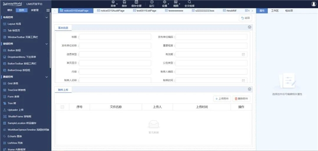 三维天地低代码开发平台内置 LIMS 产品的所有界面控件,分为布局控件、按钮控件、数据控件、输入控件、导航控件等,通过拖拽方式即可绘制出界面,方便项目实施,客户后续可自行维护,方便快捷。