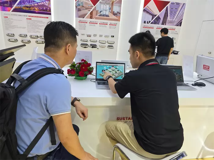 智能控制体验区,客人正在现场体验明纬智能控制产品