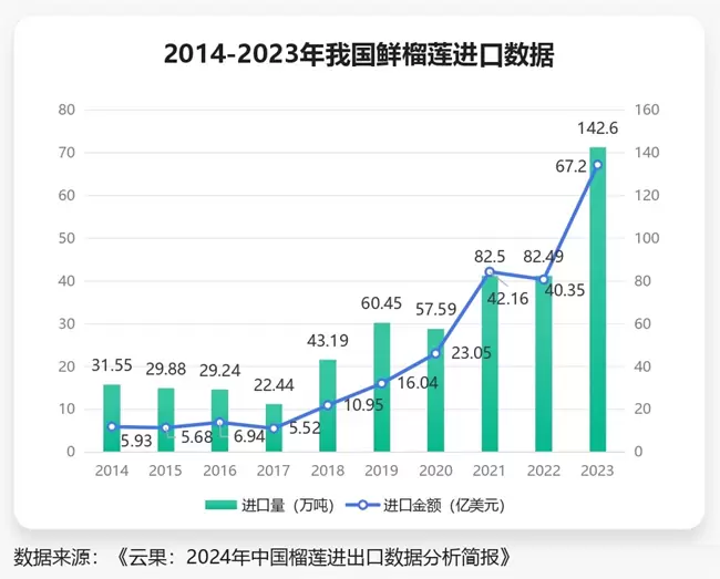 中国是全球最大的榴莲进口国,相关数据显示,2023年年,中国进口榴莲占全球市场需求的91%;2019年至2023年,中国榴莲进口量和进口金额分别增长了135.89%和318.95%,显示出这一“水果之王”在国内的强劲需求和市场潜力。