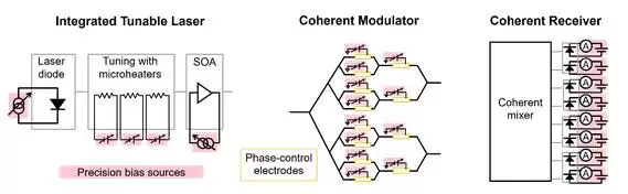 测试高度集成的光器件需要用到大量高精度的偏置信号源。以图1所示为例,对集成的可调谐波长激光源执行测试,需要为激光二极管提供精密的电流源,以确稳定的保光学性能。此外,在测试过程中还需要为每个加热器提供高精度的偏置信号源,以便精准调节半导体光放大器(SOA)的波长。同样,相干光收发信机也需要采用多个能够与相位控制电极精准同步的高精度偏置信号源,以便将电信号准确转换为光信号。