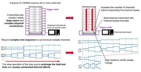 通道密度越来越高:高度集成的光器件具有更多的测试端口和元器件,需要大量高精度电源和巨大的空间。例如,一体化可调谐激光源需要为激光二极管提供精密电流源,才能确保稳定的光性能,还需要为加热器提供高精度的偏置信号源,以便精准调节波长。相干光调制器也需要采用多个能够与相位控制电极精准同步的高精度偏置信号源,以便将电信号准确转换为光信号。