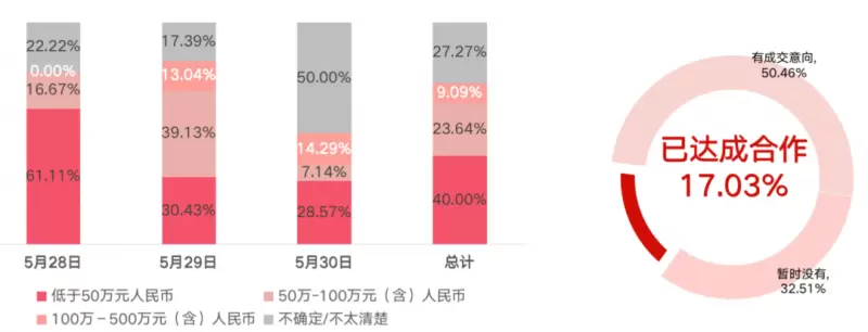 17.03%的展商已经与采购商达成合作,50.46%的展商已经有成交意向