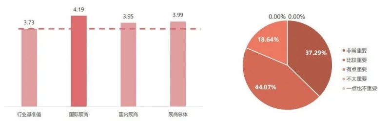 忠诚度:国际展商的重要性评价得分为4.19分,高于国内展商(3.95分)和行业基准值(3.73分)