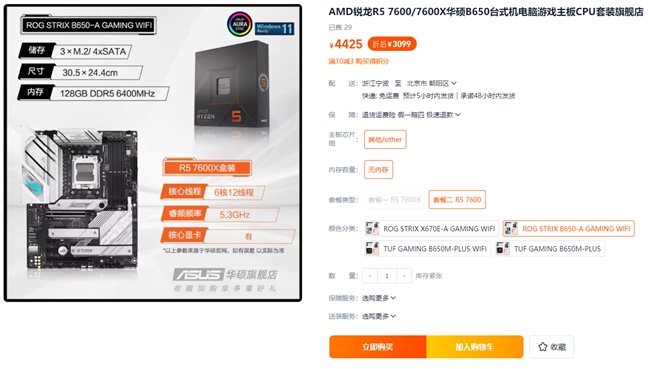且天猫商城还有华硕B650吹雪主板搭R5 7600处理器套包,折后价3099元,可享6期免息福利。