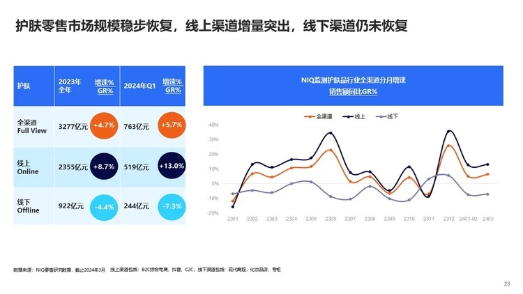 尼尔森IQ数据显示,护肤零售市场规模正在稳步回升,线上渠道增量突出。2024年第一季度,全渠道销售额同比增速达5.7%,其中线上渠道增速13%,线下渠道增速-7.3%。在护肤零售渠道格局中,抖音作为高速增长的新兴电商渠道,在2023年增速达56.6%,销售份额从18.9%提升至27.3%,并进一步彰显了其渠道重要性。在线下渠道中,百货专柜的复苏表现尤其亮眼,2023年的同比增速达3.8%。