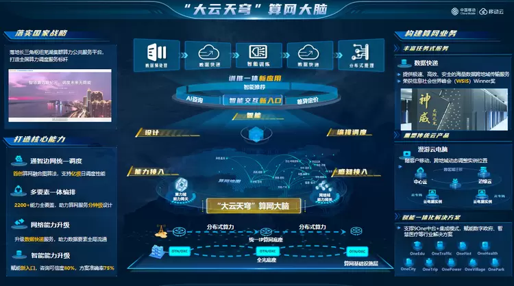 以算网大脑为载体,移动云积极承接建设国家级、省级、地市级算力调度平台,助力打造长三角枢纽芜湖集群算力公共服务平台标杆项目,推动全国一体化算力网构建。