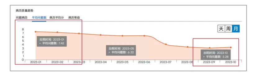 仅10个月时间,病历平均问题数从最开始的7.42个,下降到了3.28个,下降比率高达55.79%!