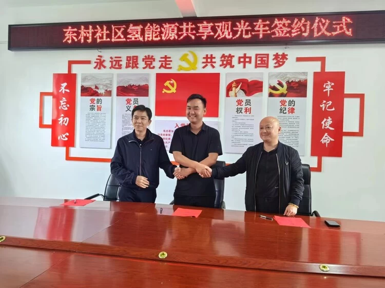活动中园区运营管理方嵩明茂源农民专业合作社、新氢动力科技有限公司、富亿农(云南)商业运营有限公司共同签署了《东村红色教育基地氢能共享观光车运营合作协议》。