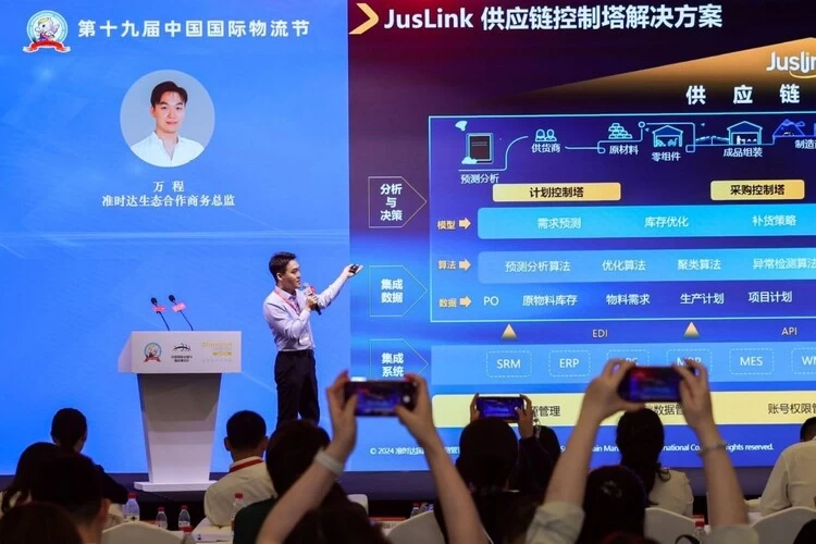 准时达不断深耕于科技创新和产品服务的迭代升级,在多年的管理实践中,逐步总结出从数据收集,到利用数据协助企业管理决策的数据运营能力,并推出JusLink数字化供应链管理平台。2023年是AI发展的里程碑之年,准时达借助AI赋能智能供应链解决方案,实现了供应链透明度的提升、决策优化、流程自动化,以及风险的预判和规避。万程向与会嘉宾介绍,准时达开发的AI供应链控制塔解决方案,通过集成OMS、TMS、WMS、ERP等企业运营系统,打造了一个供应链协同管理的统一平台,使得链主及其合作伙伴能够在一个平台上实现供应链的高效运作。