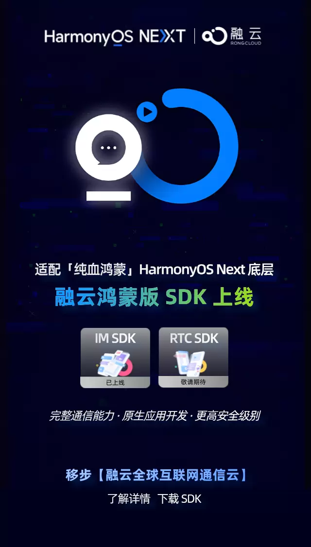 融云率先完成针对“纯血鸿蒙”操作系统的SDK研发,HarmonyOS NEXT版融云IM SDK已上线,开发者可在“鸿蒙生态伙伴SDK市场”查询使用;RTC SDK也正在紧锣密鼓推进中,近期即将上线,请大家持续关注。