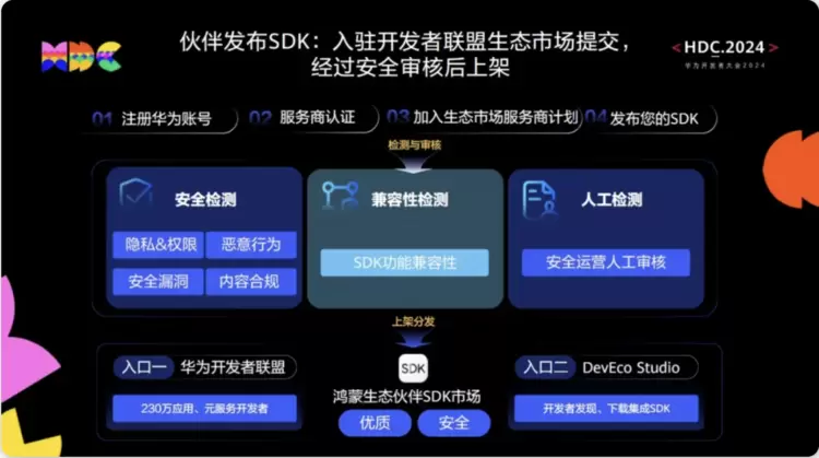 鸿蒙生态市场也对服务商入驻和SDK上架有着严格的流程规范,SDK均需经过系列安全审核。