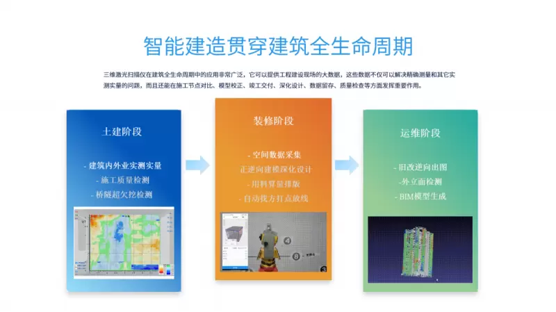 UCL360系列在建筑全生命周期中的应用非常广泛,它可以提供工程建设现场的大数据,这些数据不仅可以解决精确测量和其它实测实量的问题,而且还能在施工节点对比、模型校正、竣工交付、深化设计、数据留存、质量检查等方面发挥重要作用。