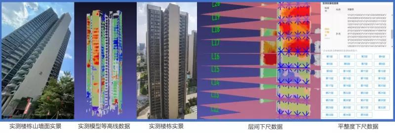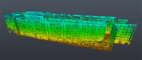 该方案使用盎锐科技的测量软件结合远距离三维激光扫描仪对高层、超高层楼体外墙外立面测量,扫描后可通过拼接、立面分割、楼层标注和云计算得到测量结果。以此结果来分析外立面的平整度和垂直度合格情况,这样不仅能提高效率,还能实现结构化数据留存,不断提高品质标准,是轻量化、可视化的建筑立面测量方案。