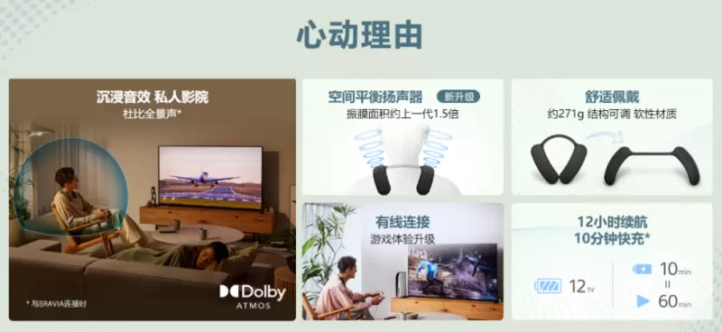 回音壁并非索尼此次交流会的全部焦点,还有一个独特的新品吸引了参会媒体的目光——颈挂式蓝牙音箱HT-AN7。HT-AN7不仅极具外形设计感,还让用户在任何场合都能享受到高品质的音乐体验。AN7的独特优势在于,和耳机对比,AN7的开放式聆听更舒适,能减少听力疲劳和损伤,自由畅连电视、手机、平板等输出设备实现沉浸式360空间音效;和回音壁对比,AN7能减少对旁人的打扰。通过自带的线缆,有线连接PS5可以体验近乎无延迟的游戏体验。作为一个可以移动的私人影院,随走随听,让用户独享高品质立体声,多场景多用途,趣玩无限。