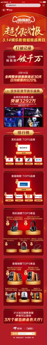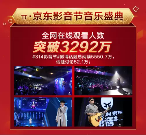 战报显示,此次京东娱乐影音超级品类日开放抢购后,仅1分钟便宣告销量破千万,3.14全网整体销售额是近30天日均销售的920%,实现火箭式增长;同时,π·京东影音节除了现场感受,网友还可以线上同步观看直播,据统计,音乐盛典全网在线观看人数突破3292万人次,#314影音节#微博话题总阅读超过5550.7万,话题讨论52.1万,千万网友助力影音节全网覆盖曝光,成为当日热点。