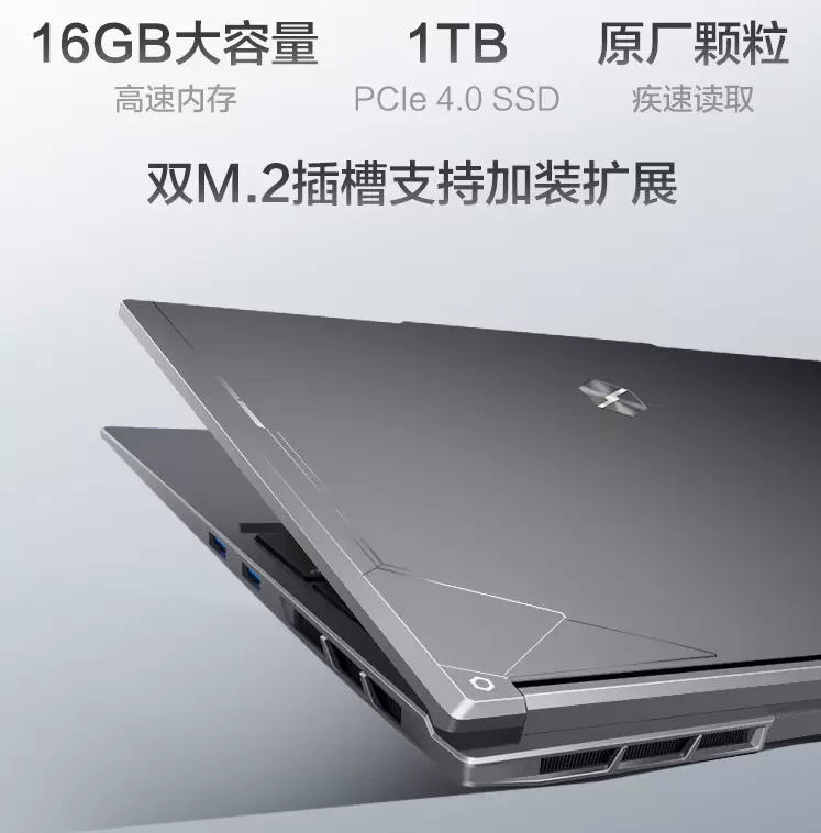 存储方面,极光X首发机型标配16GB容量的DDR5高频内存,安装于SO-DIMM插槽,玩家升级扩展更轻松。硬盘上,极光X拥有512GB和1TB两种容量可选,均为高速的PCIE4.0X4接口,速度更有保障。