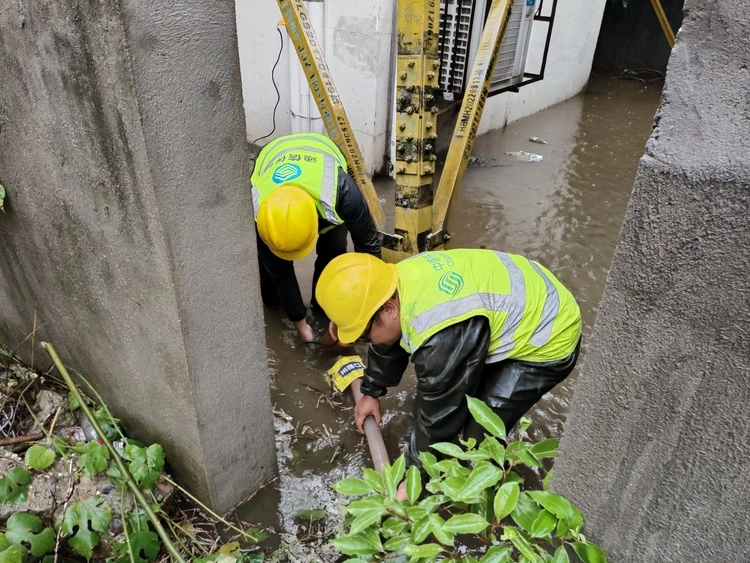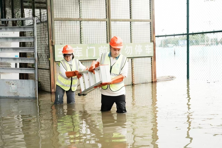 受强降雨影响洪湖府场基站机房周边积水,抢险人员冒雨排涝