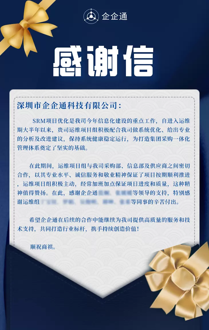 近日,珍酒李渡集团(以下简称“珍酒李渡”)向企企通发来感谢信,信中对企企通团队在SRM项目实施中所付出的努力表示感谢。