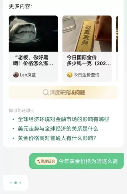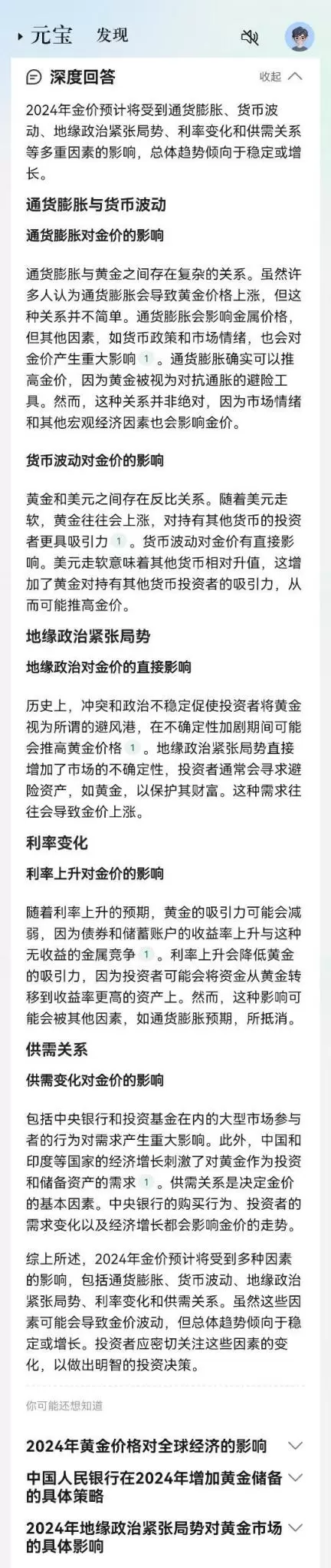此次升级的深度模式,则是在此前的基础搜索模式下,进一步拓展了问题的覆盖度和联想性。在科研、财经等专业场景下,深度搜索的效果尤为突出,深度满足专业人群需求。例如,当用户询问“今年的黄金价格为什么这么高”时,元宝能够从多个维度进行深入剖析,结合腾讯生态及其他优质内容源,为用户提供全面、深入的回答。
