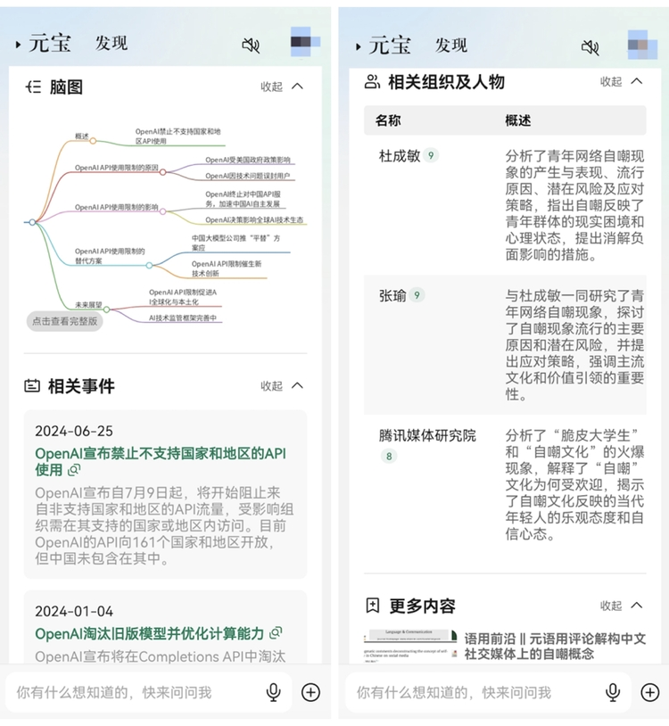 更新到最新版本后,腾讯元宝将在AI搜索深度模式下对问题进行扩展,从深度和广度两方面,提供更结构化、更丰富的回答,并可同步生成内容大纲、思维导图及相关人物事件梳理,帮助用户全景式了解搜索内容。