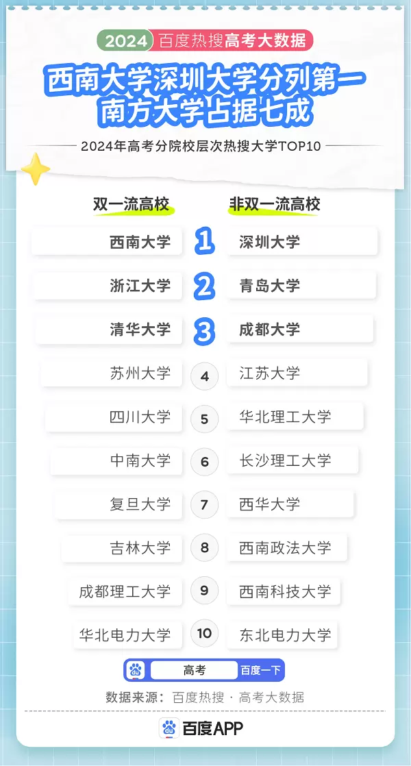 从大数据来看,不论是双一流还是非双一流的本科高校,榜单前十名几乎被南方的高校所占据。双一流高校中,除了清华大学、吉林大学、华北电力大学等高校进入热搜之外,余下七成均为南方院校,传统热门院校如西南大学、浙江大学、苏州大学、四川大学、中南大学、复旦大学纷纷上榜。