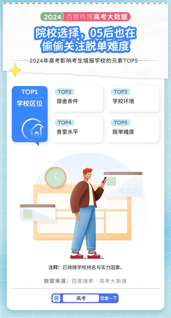 除了学校本身的实力外,学校区位成为他们的重点考察因素,方便毕业后留在有发展潜力的城市;对宿舍条件、校园环境、食堂水平等学校硬件水平的关注,则表明这届考生也很关注大学生活的舒适度和幸福感。令人意想不到的是,05后在择校时也是「恋爱脑」,脱单难度竟然也在影响考生填报学校的因素里。