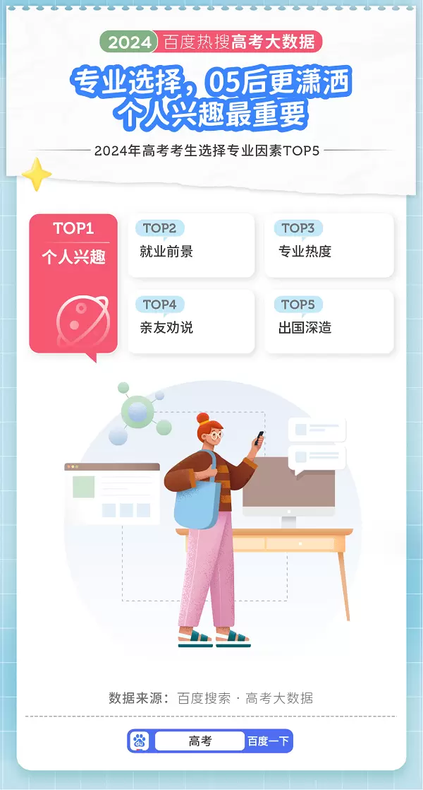 05后考生在选择专业时更洒脱,个人兴趣排在了最重要的位置,其次是就业前景、专业热度、亲友劝说、出国深造。