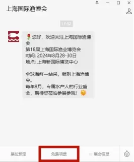 关注官方服务号(上海国际渔博会)、订阅号(World Seafood 系列展),点击菜单栏“参观注册”。根据流程进行预登记,免费领取门票。