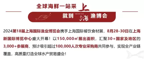2024第18届上海国际渔业博览会携手上海国际餐饮食材展,将于8月28-30日在上海新国际博览中心盛大举行!以150,000㎡展出面积,汇聚来自美国、加拿大、俄罗斯、挪威、厄瓜多尔、西班牙、智利、韩国、越南、印尼、泰国、巴基斯坦、委内瑞拉、毛里塔尼亚、希腊、土耳其、澳大利亚、印度、伊朗、马来西亚、英国、北爱尔兰等30多个国家和地区的3,000+参展商,预计吸引超过100,000人次专业采购商共同参与,覆盖全产业链,高质量打造一站式贸易殿堂!
