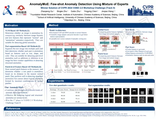 近日,在全球权威的CVPR2024视觉异常检测和创新性检测挑战赛中,中科视语AI团队提交的“少量样本异常检测使用专家混合模型”以0.818的出色成绩,从全球17个国家和地区,百余支顶尖AI团队中脱颖而出,摘下桂冠。这再次展现了中科视语在工业大模型领域的雄厚实力。