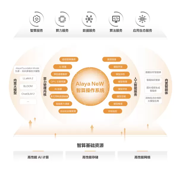 “Alaya NeW不仅是算力经济时代软件与硬件的桥接,更是定义算力基础设施的关键力量”。在硬件基础设施广泛同质化的大趋势下,Alaya NeW不仅通过全局加速优化、纳管和调度异构算力释放更大的硬件效能,还通过提供大模型的训练、微调、部署、推理等服务轻松实现人工智能核心任务。