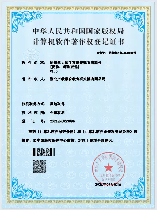 “计算机软件著作权登记证书”是国家版权局认定、含金量百分百的荣誉资质。截止目前,湖北产教融合教育研究院已获得教学质量监控保障软件、课程设计与制作软件、同等学力成绩管理系统、同等学力教务管理系统、同等学力课堂管理系统、同等学力学员信息管理系统、同等学力在线考试系统、在线直播交互系统平台软件、同等学力师生双选管理系统软件和同等学力论文管理系统软件共10项权威认证。这些荣誉不仅是湖北产教融合教育研究院长期重视科技创新、知识产权保护的体现,也意味着我院在教育信息化和管理智能化领域取得了又一亮眼的成就。