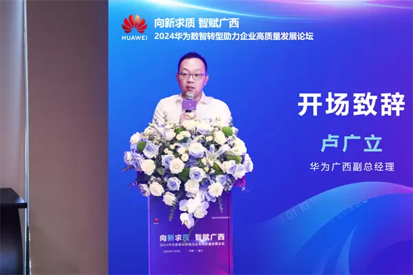 当前,科技创新进入空前的活跃期,人工智能、云计算、大数据等新兴技术广泛渗透、深度交叉融合,引领着创新和变革方向。新质生产力正在加速全行业的数字化、智能化转型进程。华为广西副总经理卢广立在致辞中表示,数智化转型的关键是通过引入新技术和新模式,解决过去无法解决的问题,为客户创造切实的商业价值。我们希望通过本次活动,启迪新思想、碰撞新路径,为企业管理创新,实现高质量发展,搭建一个交流平台。
