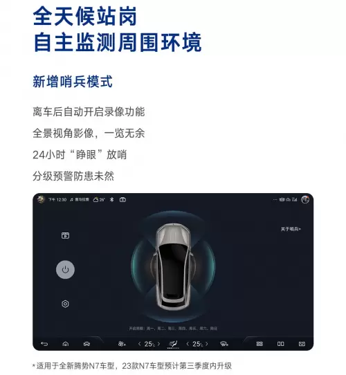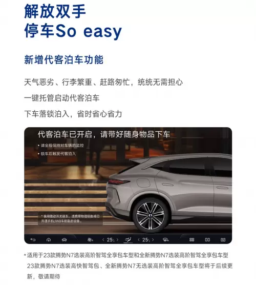 泊车有方,停车有谱,腾势N7新增代客泊车功能、哨兵模式,用户日常出行再匆忙也不慌。其中,代客泊车针对所有选装高阶智驾全享包的车型进行推送,哨兵模式针对全新腾势N7进行推送。