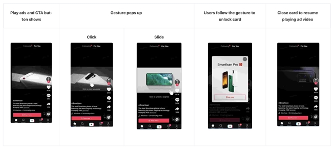 交互手势是一种创新互动样式,会邀请受众点击或滑动广告,以展示奖励或更多信息。它能有效激发受众进行交互,因为受众能通过与广告进行物理互动获得回报。如果受众不执行相应手势,广告会继续播放,奖励弹窗卡片不会出现。交互手势奖励弹窗卡片支持使用静态图片或 GIF 动图。