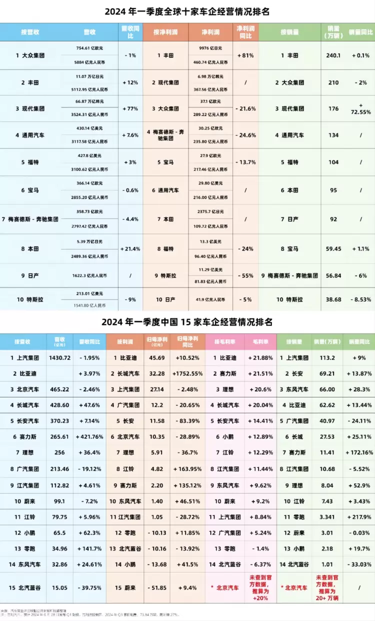 再看两组数字。一组是国际车企2024年第一季度的经营情况,一组是中国车企的经营情况。看完之后,大家的感受是什么?表面上,自主品牌市场份额在突破性增长,新能源市场渗透率更是高歌猛进,我们中国车企整体经营情况越来越差。我们是不是忙了个寂寞?这个事情是怎么发生的?