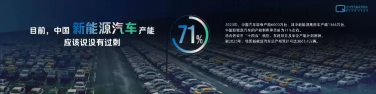 2023年,中国汽车现有产能6000万台,其中新能源乘用车产能1346万台,结合去年我国新能源汽车产销量分别达958.7万辆和949.5万辆,中国新能源汽车的产能利用率目前为71%左右。这个新能源汽车产能应该说没有过剩。结合各省市“十四五”规划、在建项目及车企产能计划测算,到2025年,我国新能源汽车总产能预计可达3661.4万辆,接近2023年产量和销量的4倍。