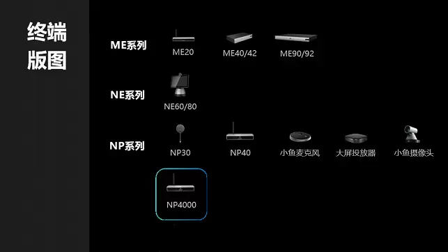经过短短三年的发展,小鱼易连终端产品线已覆盖大、中、小型会议室,并适应云视频业务全场景,形成了ME、NE、NP三大系列完整的终端产品矩阵。应用场景包括云视频会议、双师课堂、远程抢险指挥、远程医疗、远程庭审、远程客服、远程直播等。本次大会小鱼易连全新发布了电视墙服务器NP4000及全系列捆绑4G服务的终端:NE80/4G、ME20/4G和ME40/4G。