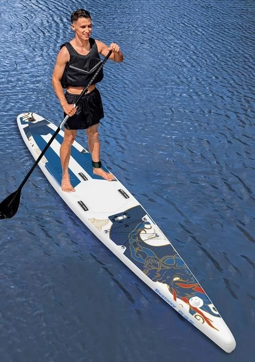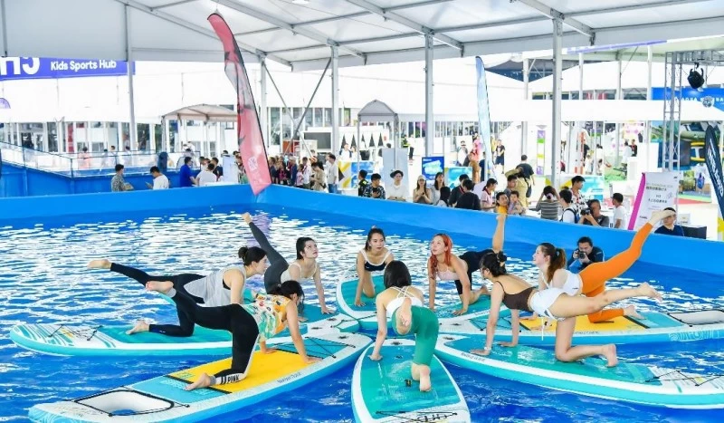此外,Bestway百适乐的“蛟龙竞速桨板“也是大家争相打卡体验的热门装备。桨板全长4.27米(14尺),宽度58厘米(23寸)。其头部设计独具匠心,可安装相机底座,随时记录桨板上的精彩瞬间。Bestway百适乐将桨板头部做得更尖,减轻了桨板头部重量,大幅提升了整体灵活性,让运动体验更加顺畅。以流线型的身姿和创新的功能配置,引领水上运动爱好者进入了一个全新的竞速时代,让每一次划水都成为一次对速度与激情的追求。