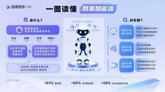 百度推出的商家智能体,是企业7X24小时在线的金牌业务员。利用巧舱平台,商家仅需5分钟即可生成专属智能体。通过使用先进的文心一言大模型