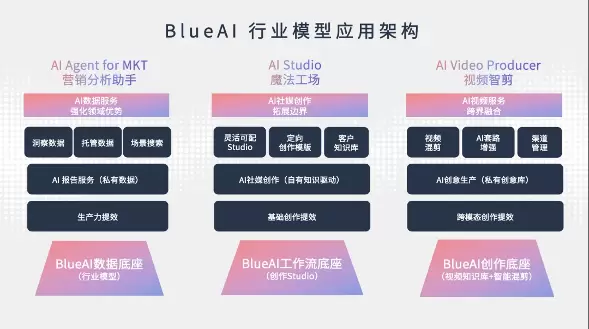 该模型定位营销场景的数据底座、工作流底座和创作底座,协助专业人员在市场洞察、营销数据分析、营销工作流提效、多模态创作上进行提质增效。同时,BlueAI在大模型运用上结合了OpenAI