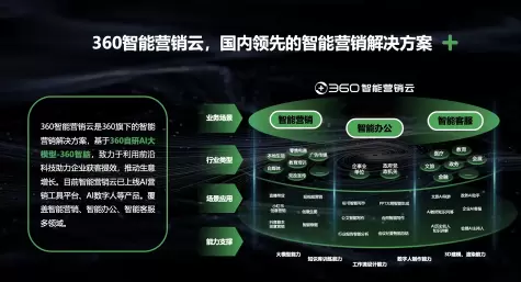 360智能营销云是360集团旗下的智能营销解决方案,依托于360自研大模型-360智脑助力企业获客提效、生意增长。360智能营销云率先采用大模型+Agent+知识库的模式,并通过调用搜索增强,提升内容的输出效率和质量。